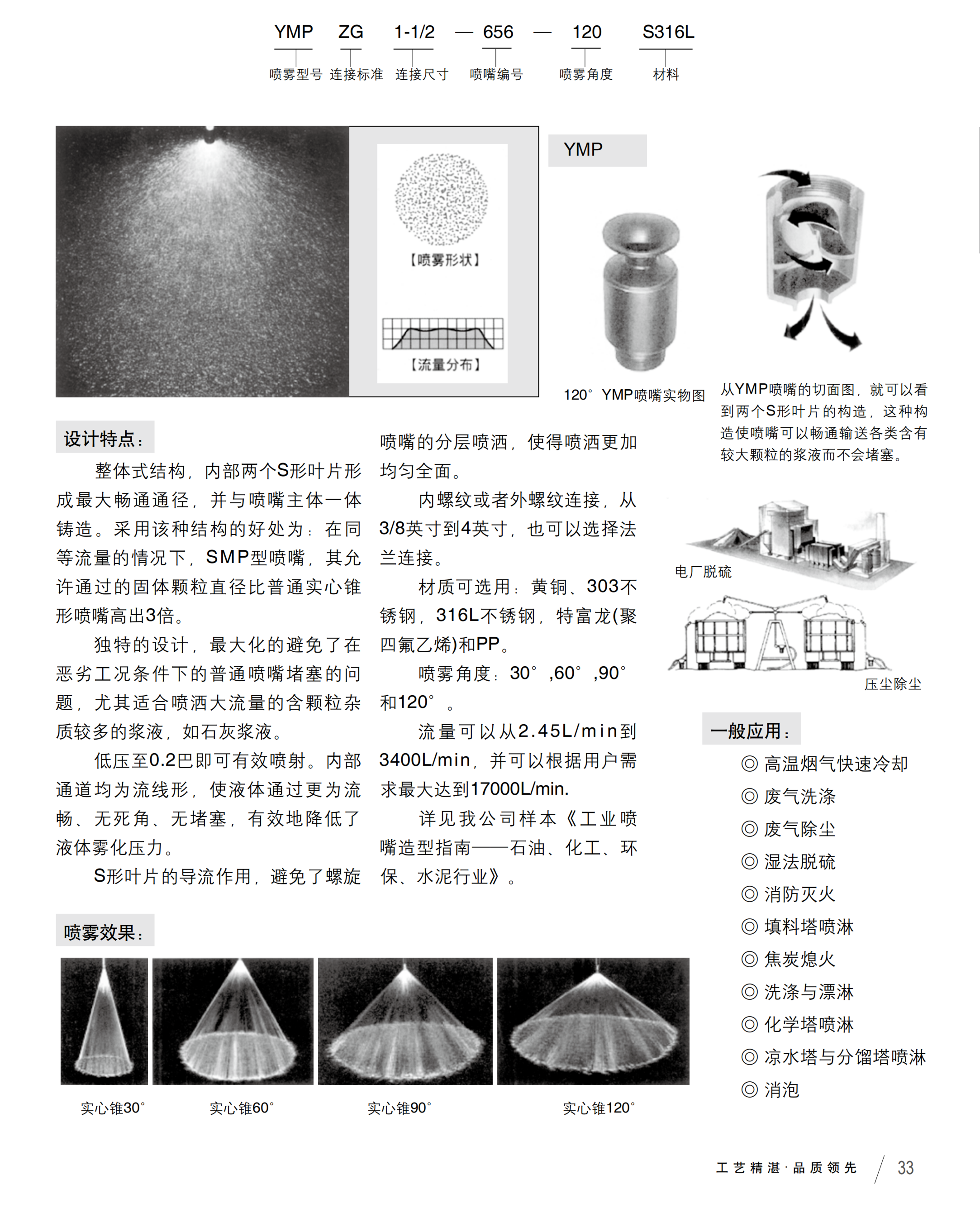 實心錐飽和器噴嘴的噴霧形狀,標準實心錐形可分,標準實心錐形噴嘴和廣角實心錐形噴嘴兩種。標準金屬錐形噴嘴的特點是能產生實心錐形噴霧形狀,噴射區域呈圓形,噴霧角度為43°-106°。實心噴霧就是燃料或其他工質均布于噴霧錐橫截面上。一般實心噴霧粒徑較粗,為了減小粒度也可采用空氣或蒸汽助霧化。