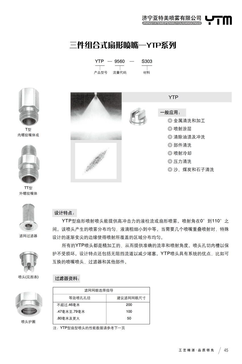 國內專(zhuan)業(ye)(ye)化(hua)生產(chan)和銷售噴(pen)嘴(zui),噴(pen)槍(qiang)和噴(pen)霧系統的技(ji)術企業(ye)(ye)三件組合式扇(shan)形(xing)噴嘴(zui)-YTSP系列